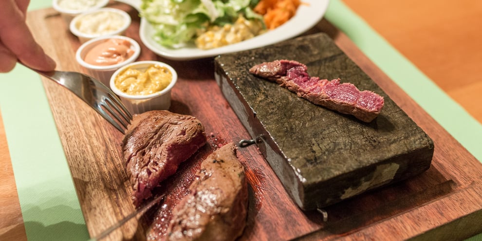 Bruzeln Sie Ihr Fleisch nach Ihrem Geschmack auf dem heissen Stein!